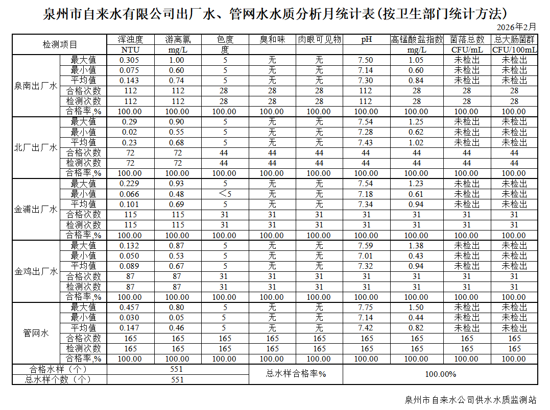 泉州市自来水有限公司出厂水、管网水水质分析月统计表(2026年2月)
